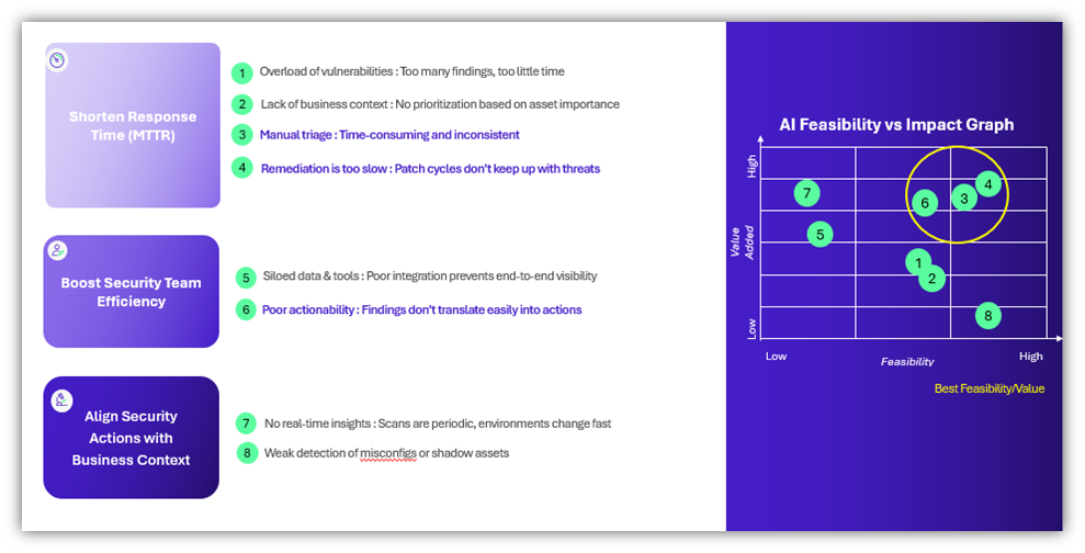 - Dans la priorisation, les outils “AI-native” apprennent des tendances d’exploitation, du comportement des analystes et du contexte des actifs pour fournir des classements de risques plus précis et pertinents et pas de simples scores CVSS génériques.