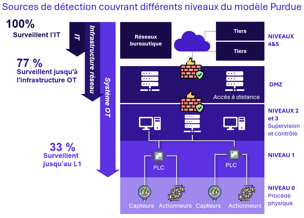 En matière d’outillage de monitoring, nous avons observé que 100 % de nos clients disposent d’outils de détection déployés du côté IT. Cependant, seul un tiers étend cette surveillance jusqu’aux couches inférieures de l’environnement industriel :