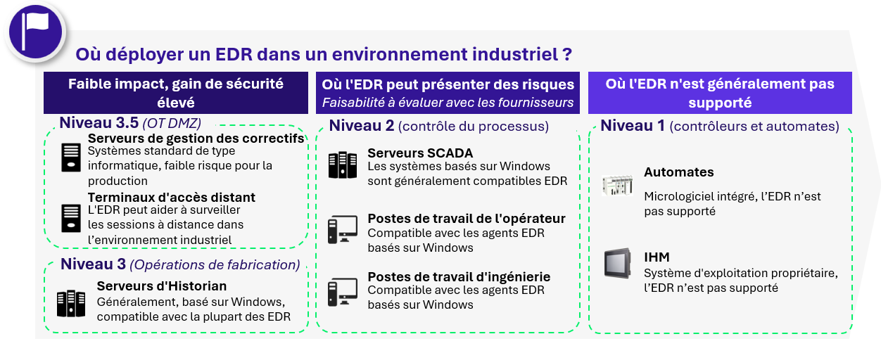 Cependant, cela ne signifie pas que 100 % des dispositifs OT sont compatibles avec les solutions EDR. En réalité, la compatibilité des EDR varie considérablement selon la diversité des systèmes industriels et leurs contraintes opérationnelles. Le déploiement de l’EDR est généralement simple aux niveaux supérieurs du modèle Purdue, tels que la Couche 3 et la Couche 3.5, où les systèmes (serveurs et postes de travail) ressemblent à des environnements IT traditionnels. À la Couche 2, l’implémentation exige des tests approfondis et une personnalisation, car les dispositifs et les protocoles sont plus spécialisés et leurs ressources limitées. Enfin, aux niveaux les plus bas (contrôleurs, PLC et équipements de terrain), l’EDR n’est généralement pas viable en raison de leur capacité de traitement limitée, de leurs systèmes d’exploitation propriétaires et de leurs exigences de performance en temps réel. Le déploiement sur de tels dispositifs risque de perturber les processus critiques ou de provoquer l’instabilité du système, et doit donc être évité.