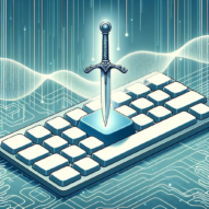 DALL·E 2023-10-05 14.58.56 – Illustration of a computer keyboard with a single key shaped like a mini sword. Surrounding this unique key are faint digital waves, symbolizing the r